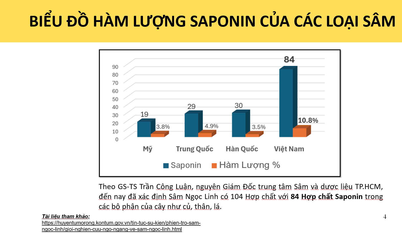Sâm Ngọc Linh, được biết đến như loại sâm tốt nhất thế giới, chứa hơn 104 hợp chất với 84 hoạt chất saponin quý giá giúp duy trì sức khỏe và nâng cao chất lượng cuộc sống. Được nghiên cứu kỹ lưỡng, sâm Ngọc Linh chứa các loại saponin : MR2, GB1, GB2, Ro, Rc, Rd, Re, Rf, Rg1, Rg2, Rg3, Rh1, Rh2 – những hoạt chất đặc biệt với tác dụng mạnh mẽ. Với việc sử dụng và chế biến sâm Ngọc Linh tươi, bạn có thể tận dụng tối đa các công năng vượt trội của loại dược liệu quý hiếm này.